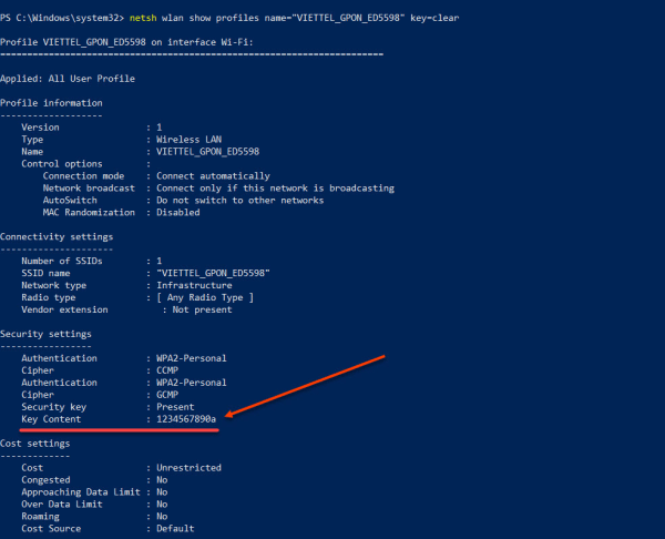 Tiếp tục sử dụng câu lệnh sau để tiến hành xem mật khẩu của Wifi